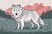 Dit prachtige ontwerp toont een majestueuze witte wolf in een serene natuurlijke omgeving. Met zijn helderblauwe ogen en dikke vacht staat de wolf centraal op een groene weide, omringd door kleurrijke bloemen. Op de achtergrond zie je indrukwekkende bergen die oplichten in een zachte roze tint, wat de scène een sprookjesachtige sfeer…