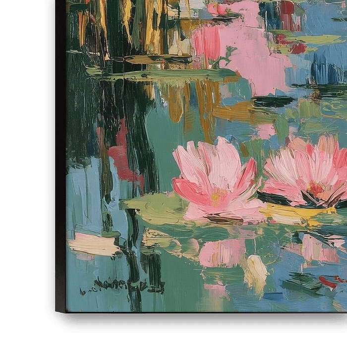 Een witte zwaan glijdt sierlijk over het water, omringd door roze en groene bloemen langs de vijver. Dit olieverfschilderij betovert met levendige kleuren, zichtbare penseelstreken en fijne details die diepte geven aan de scène. Zachte lichtreflecties en weerspiegelingen op het wateroppervlak creëren een vredige, harmonieuze sfeer. Roze tinten en zacht licht creëren samen een gevoel van rust en schoonheid - een fascinerend kunstwerk vol elegantie en kleurintensiteit.