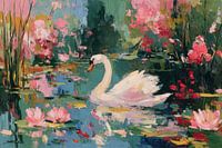 Een witte zwaan glijdt sierlijk over het water, omringd door roze en groene bloemen langs de vijver. Dit olieverfschilderij betovert met levendige kleuren, zichtbare penseelstreken en fijne details die diepte geven aan de scène. Zachte lichtreflecties en weerspiegelingen op het wateroppervlak creëren een vredige, harmonieuze sfeer. Roze…