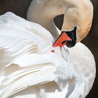 Close-up van een knobbelzwaan die rustig bezig was aan zijn mooie witte veren