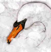 Een digitaal nabewerkte aquarel tekening van een witte zwaan of knobbelzwaan. Je ziet de kop van de zwaan in close up. Hij is bezig met het poetsen van zijn veren.