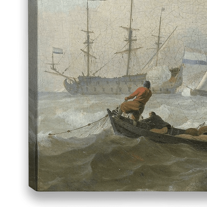 Ludolf Bakhuysen, afkomstig uit het Duitse Emden, specialiseerde zich in Amsterdam in de zeeschilderkunst. Op dit doek gaf hij verschillende scheepstypen weer op het woelige water onder een dramatische wolkenlucht. Rechts vaart een jacht met groots vlagvertoon. Op het wapperende doek schilderde Bakhuysen zijn naam. Links op de voorgrond trekt een visser vanuit een schuitje zijn netten op. Op de achtergrond ligt een oorlogsschip voor anker, dat juist een saluutschot geeft.