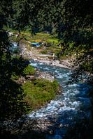 Woeste rivier raast langs dorpje. van Floyd Angenent