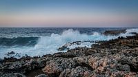 Deze woeste zee, beukt golven op de rosten van Ibiza, de een ruige omgeving waar het water over de rosten omhoog spatten, met een ondergaande zon , met een prachtige kleurrijke lucht.
