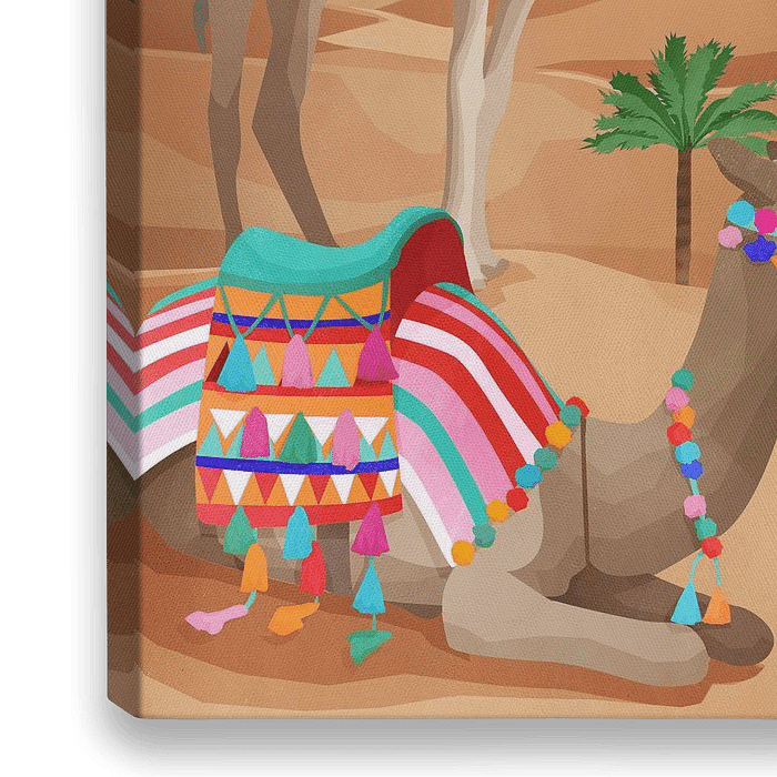 Kleurrijke print van twee dromedarissen in de woestijn, met pyramides op de achtergrond.