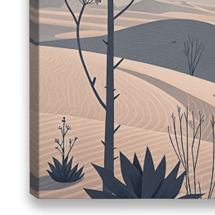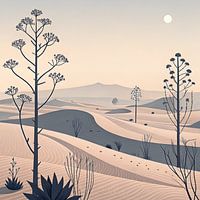 Een etherische en minimalistische illustratie vangt de serene schoonheid van een dor landschap. Zachte duinen strekken zich uit onder een zachte, heldere hemel waar de zon een subtiele gloed werpt. Torenhoge, elegante woestijnplanten met delicate vertakkingspatronen domineren de voorgrond. Hun silhouetten vormen een opvallend contrast…