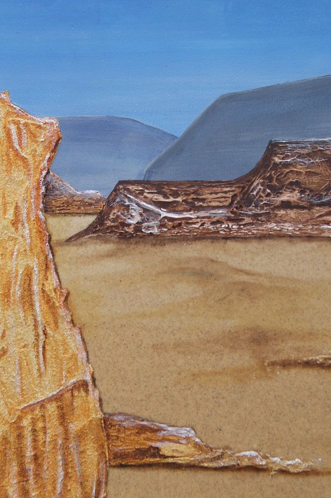 Je ziet de eenzaamheid en leegte in dit landschap. Je voelt de warmte van het woestijnzand. Een strak blauwe lucht met een wolkenflard.