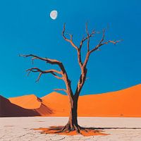 Een eenzame boom strekt zijn knoestige takken uit tegen de heldere, wolkenloze hemel, terwijl de gloeiende zandduinen zachtjes naar de achtergrond stromen in warme oranje tinten. De maan, bijna mystiek, waakt over dit dorre landschap en versterkt het gevoel van afgelegenheid en tijdloosheid in deze indrukwekkende woestijn.