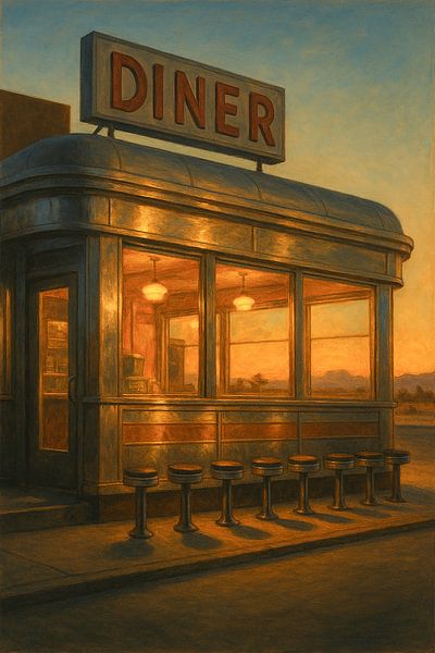 Dit betoverende en serene schilderij toont een klassiek, met chroom bekleed eethuis tegen een uitgestrekt, open woestijnlandschap bij zonsondergang. De grote glazen ramen bieden een heldere blik in het interieur, waar warme hanglampen een rij lege barkrukken en de toonbank verlichten. De metalen buitenkant van het restaurant…