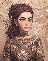 Deze jonge prinses heeft een stoere blik in haar ogen. Ze kijkt schuin links omhoog met een onoverwinnelijke blik. De achtergrond is uitgevoerd in beige en aardse klei tinten. Deze jonge vrouw heeft bruine krullende haren. Haar trui bevat heel veel organische details.