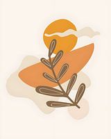 Dit abstracte digitale kunstwerk roept de rustige schoonheid op van een woestijnlandschap bij zonsondergang. Warme oranje- en crèmetinten mengen harmonieus en suggereren de ondergaande zon en het zachte zand. Een gestileerd botanisch element voegt een vleugje organisch leven toe aan de minimalistische compositie, terwijl subtiele texturen diepte en visuele interesse creëren. Het algemene effect is er een van vredige contemplatie en de stille grootsheid van de natuur.