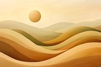 Zachte, golvende heuvels in aardetinten vloeien harmonieus over in de verte, terwijl de zachte zon aan de horizon schijnt. Dit vredige landschap straalt een kalmerende warmte uit, het spel van licht en schaduw benadrukt de subtiele schoonheid van de natuur en nodigt je uit om te dromen. Een plek van rust en een meditatief moment.