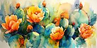 De achtergrond, een zachte fusie van waterverfkleuren, creëert een dromerige sfeer die de aandacht vestigt op de gedetailleerde cactussen en hun bloesems op de voorgrond. De bloemen variëren in tinten van diep oranje tot geel, wat een warm contrast vormt met de koelere groene en blauwe tinten van de cactuslichamen. De kunstenaar heeft met zorg en precisie de unieke texturen en stekels van elke cactus vastgelegd, waardoor het werk een gevoel van diepte en realisme krijgt, terwijl het toch een abstracte kwaliteit behoudt door de losse en expressieve schildertechniek.