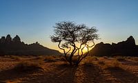 De scène is gevangen in een afgelegen deel van de Arabische woestijn in Saoedi-Arabië. Deze eenzame boom staat op een woestijnplateau omringd door rotsachtige bergen.