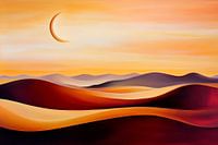 Gouden zandgolven strekken zich uit onder een zachte, oranjekleurige hemel, terwijl de ranke maan mysterieus over het landschap zweeft. Het harmonieuze kleurenpalet is rustgevend en uitnodigend, ideaal voor een slaapkamer waar het de kamer vult met een gevoel van kalmte en mijmering. Perfect voor ontspannen avonden en zachte gedachten.