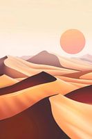 Zacht gebogen zandduinen ontvouwen zich in warme aardetinten, terwijl een gloeiende bol zonlicht aan de horizon zweeft. Het harmonieuze kleurenpalet roept een gevoel op van uitgestrekte ruimte en warmte, terwijl de golven van zand zachte reliëfs vormen die doen denken aan een schilderachtige woestijn. Een plek van rust en eindeloze…