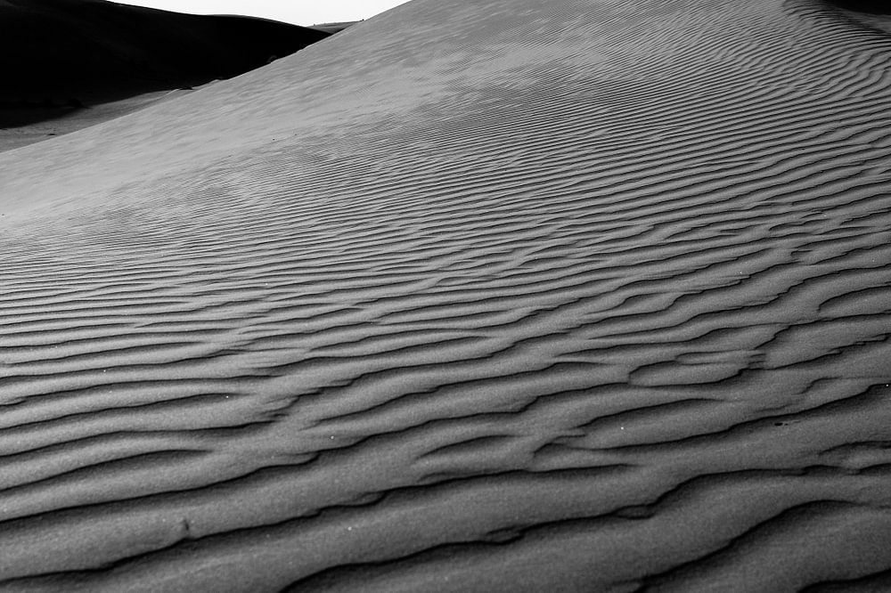 een prachtig zwart wit beeld van de Whahibi Sands woestijn in Oman. Gemaakt bij zonsopkomst. Door de laagstaande zon komen de ribbels, die diagonal over het beeld lopen, in het zand goed naar voren.