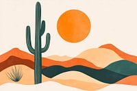 Een stralende zonsondergang baadt de zachte woestijntinten in warm licht, terwijl een majestueuze cactus trots op de voorgrond staat. De harmonieuze kleuren en zachte lijnen geven dit kunstwerk een rustgevende touch, perfect voor een woonkamer om een ontspannen en uitnodigende sfeer te creëren.