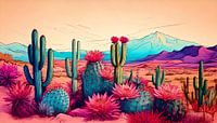 Grafische compositie van een woestijnlandschap met talrijke cactussen. De glinsterende heldere kleuren worden gecombineerd met de grafische vorm van de cactussen, waarvan sommige in bloei staan, waardoor een verrassend contrast ontstaat met de dorheid van de omringende woestijn. Het algemene effect is er een van desoriëntatie in een…