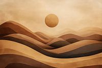 Een landschap ontvouwt zich in zachte aardetinten, glijdend door de tijd als golven. Een gloeiende bol zonlicht zweeft majestueus boven de glooiende heuvels en baadt alles in warm licht. De harmonieuze vormen en het kalme kleurverloop nodigen je uit voor een meditatieve reis die een gevoel van ruimte en rust uitstraalt.