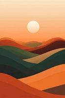 In zachte golvingen smelten warme aardetinten samen met het zachte oranje van de zonsondergang. Een stralende bol zonlicht zweeft majestueus over de heuvels, terwijl de harmonieuze kleuren een vredige sfeer creëren. Het is een plek van rust, waar hemel en aarde samen dansen en de dag overgaat in een dromerige nacht.