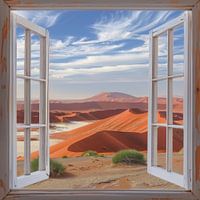 Ervaar de adembenemende schoonheid van de woestijn door dit indrukwekkende kunstwerk. De rode duinen en het briljante blauw van de lucht creëren een indrukwekkende achtergrond die perfect wordt geaccentueerd door het open raam. Ideaal voor avonturiers en liefhebbers van unieke landschappen. Dit decor brengt een exotische en inspirerende sfeer in elke kamer. Perfect voor de woonkamer, kantoor of slaapkamer, dit beeld creëert een verbinding met de indrukwekkende uitgestrektheid van de natuur.