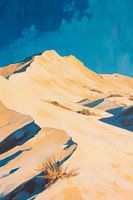 Zachte zandduinen onder een helderblauwe hemel voeren de kijker mee naar een rustig, afgelegen landschap. De levendige contrasten en schaduwrijke vormen creëren een uitnodigende sfeer die perfect is voor een woonkamer. Hier versmelt natuurlijke rust met moderne elegantie, ideaal voor ontspannen gesprekken en creatieve gedachten.