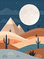 Een serene en gestileerde digitale illustratie van een woestijnlandschap onder de zachte gloed van een volle maan. Grillige bergen rijzen op in de verte, terwijl glooiende zandduinen en schaarse vegetatie, waaronder de iconische saguaro cactussen, de voorgrond domineren. Zachte golven suggereren een verborgen oase of een fata morgana en…