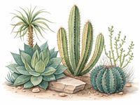 Een illustratie in aquarelstijl met een verscheidenheid aan woestijnflora. Het kunstwerk toont een lange, slanke palmachtige plant met stekelige bladeren, een grote rozetvormige vetplant met vlezige, puntige bladeren, verschillende zuilcactussen met prominente ribben en stekels, een ronde toncactus bedekt met scherpe stekels en andere…