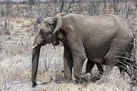 Woestijnolifant die in de opgedroogde Hoanib-rivier in Namibië lopen. Woestijnolifanten zijn Afrikaanse busholifanten die hun thuis hebben gevonden in de Namib-woestijnen. Zijn solitair en zwerven over grote gebieden