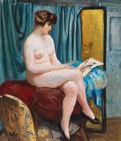 Koop dit moderne kunstwerk Wojciech Weiss, Vrouwelijk naakt lezend bij een blauw gordijn van Atelier Liesjes op canvas, aluminium dibond, (ingelijste) fotoprint, behang en ArtFrame, op maat geprint in Fine-Art kwaliteit.