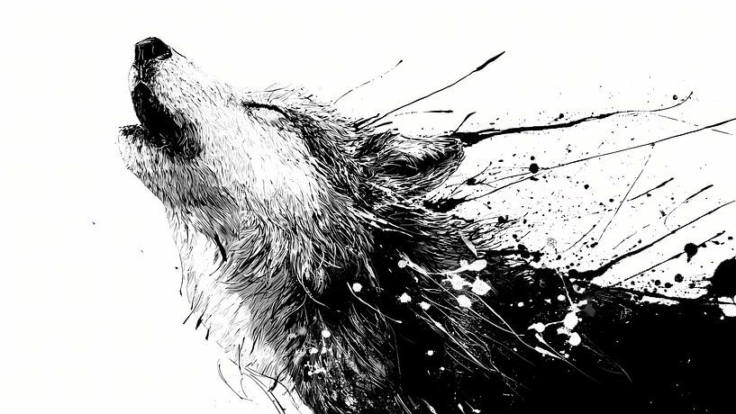 De wolf heft zijn kop op naar een onzichtbare horizon, zijn gehuil wordt gevisualiseerd door opstijgende inktfragmenten. Het lichaam lijkt gedeeltelijk opgelost, maar de houding blijft sterk. Er is geen roedel te zien, maar de roep houdt aan. Expressie wordt identiteit in plaats van afhankelijkheid. De opstijgende spatten suggereren…