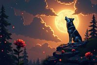 Digitale illustratie: Wolf huilend bij maan met bloemen en bos