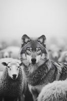 De zachtaardige schapen gaan harmonieus op in hun omgeving te midden van een rigide tafereel, terwijl de wolf indrukwekkend aanwezig is met zijn doordringende blik. De zwart-wit afbeelding versterkt het drama en creëert een boeiende sfeer die zou kunnen schitteren als een indrukwekkend kunstwerk in een moderne woonkamer of kantoor.