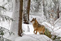 Wolf (Canis lupus) in de winter in het dierenverblijf in het Nationale Park van het Beierse Woud, Duitsland.