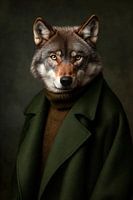 In een sfeer van mysterie verrijst een indrukwekkend wezen met het wilde gezicht van een wolf en de elegante verschijning van een fashionista. De diepgroene vacht streelt de figuur, terwijl de doordringende ogen een verhaal vertellen van kracht en gratie. Mens en dier smelten hier samen tot een fascinerende eenheid.