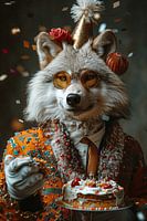 Een wolf in feestkleding met een verjaardagsmuts en een taart heeft het zichtbaar naar zijn zin in de studio.