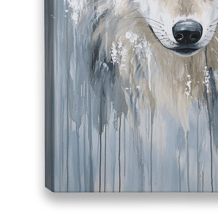 Dit krachtige schilderij toont de imposante kop van een wolf, prachtig weergegeven met een mix van expressieve penseelstreken en druppelende verf. De grijs-witte tinten creëren een monochroom effect, terwijl de details van de vacht realistisch en dynamisch overkomen. Het ontwerp heeft een moderne en abstracte uitstraling, wat het…