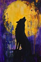 Deze prachtige kunstweergave toont een silhouet van een wolf die huilt naar een volle maan, omlijst door levendige kleuren zoals diep paars, warm geel en accenten van blauw en oranje. Het contrast tussen de zwarte wolf en de heldere achtergrond maakt het schilderij zowel krachtig als mystiek. Perfect als blikvanger in moderne woon- of…