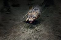 Wolf: De wolf is het centrale punt van de foto. Hij rent recht op de camera af, met zijn bek open en zijn tanden ontbloot. Zijn vacht is grijs en bruin, en zijn ogen zijn geel.