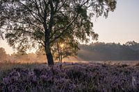 Landschap op de Wolfhezer heide in Doorwerth, Gelderland, met zicht op enkele bomen waar achter de zon voor mooi licht zorgt