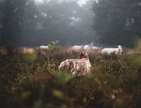 landschap op de Wolfhezer heide in Doorwerth, Gelderland, waar de schapen staan te grazen op een mistige morgen