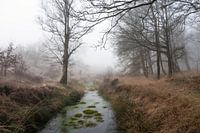 Landschap op de Wolfhezerheide in Doorwerth, op de Veluwe in Gelderland. Het is een koude en mistige winterochtend.