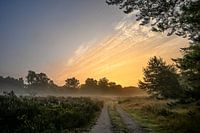 Landschap op de Wolfhezerheide in Doorwerth, op de Veluwe in Gelderland. De lucht kleurt prachtig door de opkomende zon en er hangt een laagje nevel.
