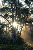 Landschap in de bossen van de Wolfhezerheide in Doorwerth. Het is een prachtige en mistige ochtend en de opkomende zon zorgt voor mooie stralen.