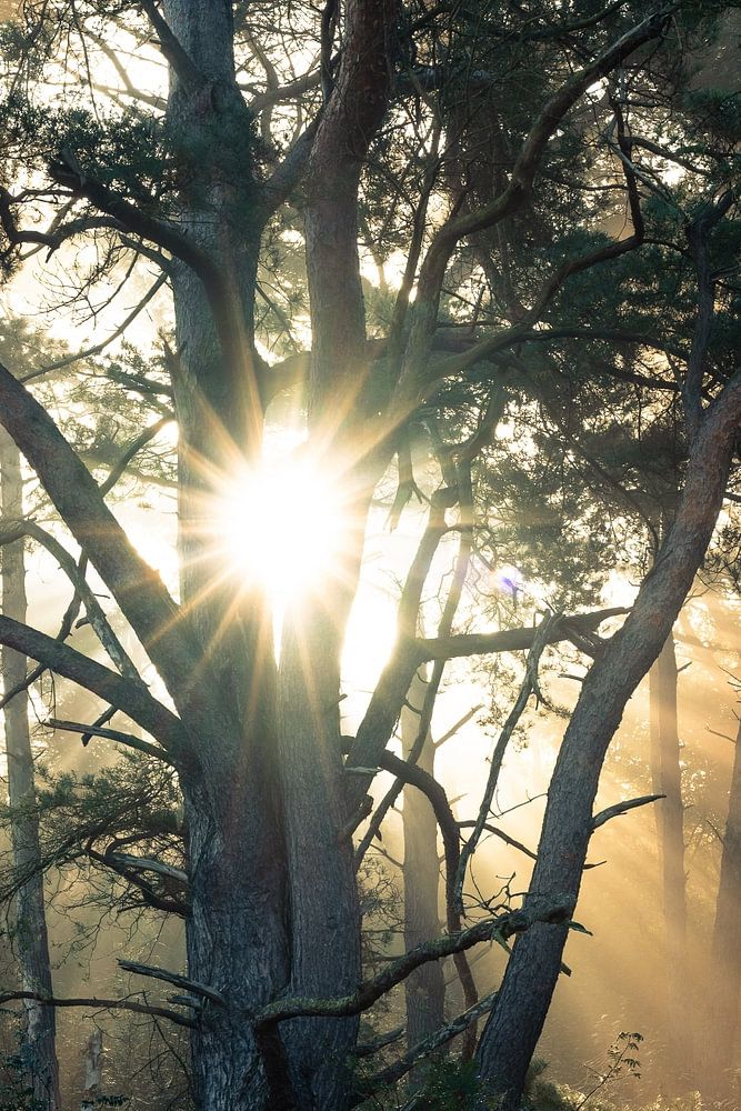 Landschap in de bossen van de Wolfhezerheide in Doorwerth. Het is een prachtige en mistige ochtend en de opkomende zon zorgt voor mooie stralen.