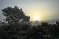Landschap op de Wolfhezerheide in Doorwerth. Het is een prachtige en mistige ochtend en de opkomende zon zorgt voor een warm licht.