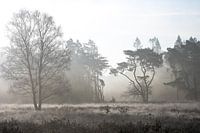 Landschap op de Wolfhezerheide in Doorwerth, op de Veluwe in Gelderland. Het is een koude ochtend in maart en het is mistig. De zon komt op en zorgt voor een mooie sfeer.