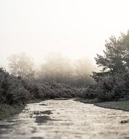 Landschap op de Wolfhezerheide in Doorwerth, op de Veluwe in Gelderland. Het is een koude ochtend in maart en het is mistig. De zon komt op en zorgt voor een mooie sfeer.