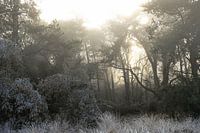 Landschap op de Wolfhezerheide in Doorwerth, op de Veluwe in Gelderland. Het is een koude ochtend in maart en het is mistig. De zon komt op en zorgt voor een mooie sfeer.